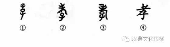 這個“孝”字也挺有意思。甲骨文①像長著長頭發的老人。金文②的上部是面朝左長著長頭發的駝背“老人”,“老人”之下有“子”(小孩),老人的手按著小孩的頭,是小孩用頭扶持老人行走,真是個“孝子”啊。小篆③也基本上同于金文,只是老人的手不像了。④是楷書的寫法,完全失去了象形的意味。