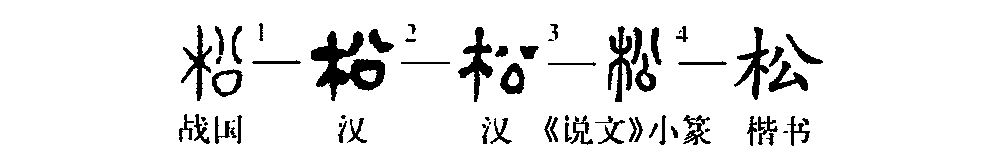 ?“下簾危坐聽松濤。”這個“松”字是形聲字。①是金文的形體。左邊是“公”表聲;右邊為“木”,表形。②是小篆的形體,將金文的“公”與“木”的位置對換過來。③是楷書的寫法。
