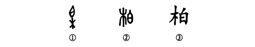 這是“翠柏高千尺”的“柏”字。金文①的下部是“木”,即柏樹的形象,其上部是“柏球”(柏子)的樣子。這本來是個象形字,可是小篆②把“柏球”偽變成“白”字,移到“木”的右邊,并以“木”為形符,以“白”為聲符,變成一個形聲字了。楷書③則與小篆的形體相類似,也是個形聲字。