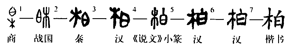 形聲字。從木,白聲。本義是樹木名,柏樹,一名椈(jú)。《爾雅·釋木》:“柏,椈。”《詩·小雅·天保》:“如松柏之茂,無不爾或承。”又《邶風·柏舟》:“泛彼柏舟,亦泛其流。”毛傳:“柏木,所以宜為舟也。”柏又有假借義。清段玉裁《說文解字注》:“柏,古多假借為伯仲之伯、促迫之迫。”前者(音bó)如:《晏子春秋·內篇諫上五》:“令柏巡氓,家室不能禦者,予之金。”俞樾平議:“柏,亦官名也。……古柏與伯通。”后者(音pò)如:《周禮·春官·司幾筵》:“其柏席用黼純。”鄭玄注引鄭司農云:“柏席,迫地之席。”字或從百聲作栢。唐張參《五經文字·木部》:“柏,經典相承亦作栢。”《玉篇·木部》:“栢,木名。《詩》曰:‘泛彼栢舟。’”《廣韻·陌韻》:“柏,亦作栢。”新中國成立后,“栢”作為異體字并入了“柏”字。(冀小軍)