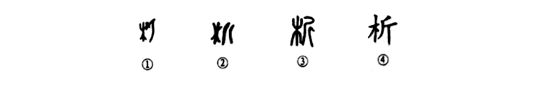這個(gè)“析”字是個(gè)會(huì)意字。你看甲骨文①的形體,其左邊就是一棵樹(shù)(木),右邊是一把平刃曲柄的大斧頭(錛屬),是用斧砍樹(shù)(木)的意思。②是金文的寫(xiě)法,其左邊仍是木,右邊的大斧頭變?yōu)?ldquo;斤”形,不太像斧頭的樣子了。小篆③是直接由金文蛻變而來(lái),形體基本相似,只是把直筆變?yōu)榍P罷了。④是楷書(shū)的寫(xiě)法,也是從“木”從“斤”,沒(méi)有發(fā)生過(guò)偽變。