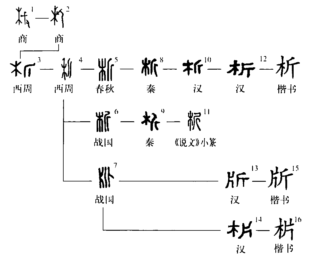 會(huì)意字。商代金文(字形1)像手持斧破木之形;甲骨文(字形2)省去手形,又用較常見(jiàn)的“斤”字替代了像斧形的部分(斧、斤是同類(lèi)的工具。參見(jiàn)斤部“斤”字條)。西周文字從木、從斤。春秋文字(字形4)“木”旁訛為“禾”。戰(zhàn)國(guó)文字(字形5)承襲商周文字,從木、從斤,為秦漢及后世文字所本;字形6“斤”旁上部彎曲,為秦代隸書(shū)或體及《說(shuō)文》小篆所本;字形7改從“木”為從“片”(像破開(kāi)之半木形),取意相同,為漢代隸書(shū)或體所本。受這種寫(xiě)法的影響,漢代隸書(shū)中還出現(xiàn)了從“木”從“片”的俗體。“析”,本義是劈開(kāi)(木頭)。《說(shuō)文》:“析,破木也。” 《廣韻·錫韻》:“析,字從木、斤。?,俗。”《集韻·錫韻》:“析,或從片,古作版。”《詩(shī)·齊風(fēng)·南山》:“析薪如之何? 匪斧不克。”漢王充《論衡·量知》:“斷木為槧,?之為板,力加刮削,乃成奏牘。”引申指分開(kāi),分散。《廣韻·錫韻》:“析,分也。”《書(shū)·盤(pán)庚下》:“今我民用蕩析離居,罔有定極。”成語(yǔ)有“分崩離析”。又引申指分析,剖析。晉陶潛《移居》二首之一:“奇文共欣賞,疑義相與析。”(冀小軍)