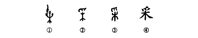 這是“花榮堪采”的“采”字,是個會意字。甲骨文①的上部是一只手(爪),下部是一棵樹,樹上的小圓圈表示果子,真是枝葉繁茂,碩果累累。手在果上表示采摘。②是金文形體,大體上與甲骨文相似,只是果形省掉了。③是小篆形體,與金文基本相同。④是楷書的寫法,由小篆直接演變而來。