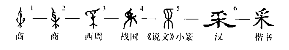 會意字。商代文字(字形1)從爪(像手),從枼(“葉”的初文。參看“枼”字條),會采摘樹葉之意。“枼”,后省作“木”。本義是摘取。《說文》:“采,捋取也。”《詩·唐風·采苓》:“采苓采苓,首陽之巔。”《史記·伯夷列傳》:“登彼西山兮,采其薇矣。”引申為采用。《史記·秦始皇本紀》:“采上古帝位號,號曰‘皇帝’。”又借用為彩色之彩。《玉篇·木部》:“采,色也。”《禮記·月令》:“命婦官染采。”鄭玄注:“采,五色。”這個意思后來寫作“彩”。引申指彩色的絲織品。漢晁錯《論貴粟疏》:“故其男不耕耘,女不蠶織,衣必文采,食必粱肉。”《漢書·貨殖傳》:“文采千匹。”顏師古注:“帛之有色者曰采。”這個意思后來寫作“綵”。新中國成立后,“綵”作為異體并入了“彩”字。“采”又音cài,指采邑(古代諸侯分封給卿大夫的土地)。《漢書·刑法志》:“此卿大夫采地之大者也。”這個意思后來寫作“寀”,亦作“埰”。由于“采”有諸多引申義和假借義,所以曾分化出加注“手”旁的“採”來表示本義。新中國成立后,“採”和“寀”作為異體字并入了“采”字。(冀小軍)