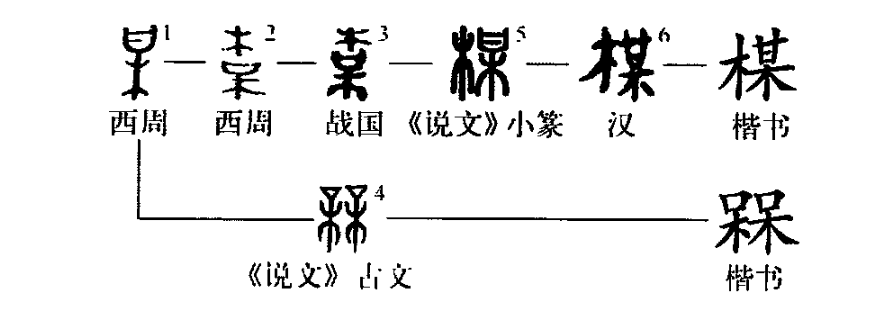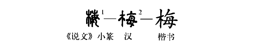 《說文》:“梅,枏也,可食,從木每聲。”許慎的說法不確。“枏”是“楠”的異體字,是指一種常綠的喬木,也名“梅”,不能食。后世的“梅”則是一種酸甜的果子,俗稱“梅子”,如《詩經•召南•摽有梅》:“摽有梅,頃筐塈之。”意思是:梅子完全落了地,拿著淺筐來拾取。這是兩種不同的植物,取“梅”為酸果之名,可能是假借“梅”為“楳”吧。