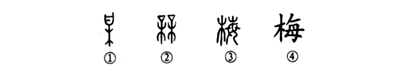“望梅止渴。”這個“梅”字本為象形字。①是金文的形體,下部是梅樹(木),枝上長了一個大梅子。②是古文的形體,是并栽的兩棵梅樹,上部均長了梅子。(前面的兩種形體,實際上就是后世的“楳”字。《說文解字注》:“如南之梅,今之酸果也。”正是指“梅子”。)③是小篆的形體,變成“從木每聲”的形聲字了。④為楷書的寫法。
