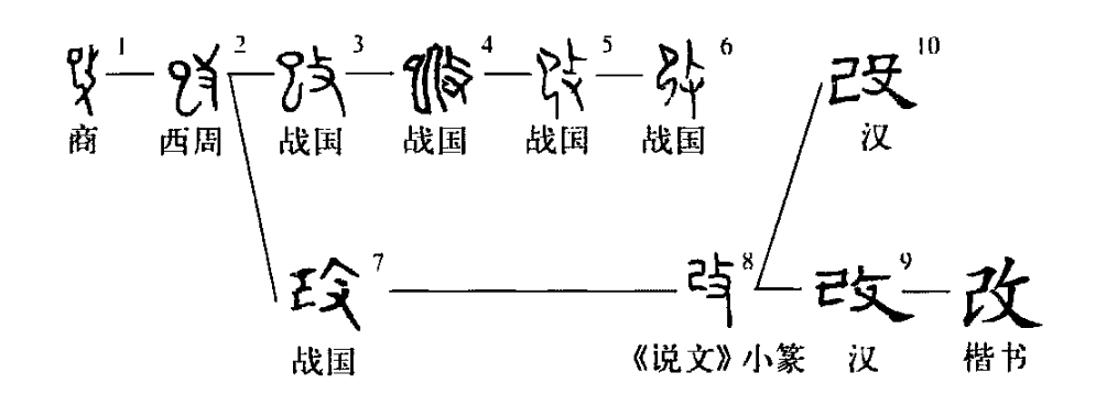 會(huì)意兼形聲字。從攴,從己(己亦聲)。形旁攴為手持器械治事狀,表示改字本義與治事有關(guān);形旁兼聲旁己,像隿射之繳,含約束意,表示改字本義與此有關(guān)且表聲,改與己同為見紐之韻。改字見于西周,初時(shí)蓋借用攺(yǐ)字為之,與攺?fù)?/span>