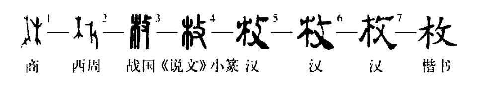 會意字。從木,從攵(攴pū)。《說文》:“枚,干也,可為杖。”段玉裁注:“支,小毄(撃)也。……杖,可以毄人者也。故取木、支會意。”本義是樹干。《詩·周南·汝墳》:“遵彼汝墳,伐其條枚。”毛傳:“枝曰條,干曰枚。”又指樹枝。《廣雅·釋木》:“枚,條也。”王念孫疏證:“散文則枝亦稱枚。《玉篇》、《廣韻》并云:‘枚,枝也。’”引申指馬鞭。《左傳·襄公十八年》:“以枚數闔。”杜預注:“枚,馬檛也。闔,門扇也。”又,古代行軍時為防止喧嘩,讓士兵銜在口中的小棍亦稱枚(形狀像筷子,兩端有帶,可系于頸上)。晉左思《吳都賦》:“銜枚無聲。”宋歐陽修《秋聲賦》:“又如赴敵之兵,銜枚疾走。”又用為量詞,個。《玉篇·木部》:“枚,箇也。”南朝宋謝惠連《祭古冢文》:“棺上有五銖錢百余枚。”(冀小軍)