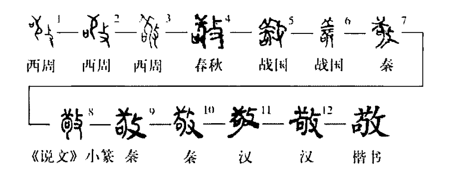 形聲字。《說文》:“敬,肅也,從攴茍。”徐灝段注箋:“《釋名》曰:‘敬,警也,恒自肅警也。’按敬有戒謹義,茍訓急敕,敕者,戒也。其義相近,聲也相轉,疑即古敬字,從茍加攴,支,治也,治事肅恭之意。”西周早期金文以茍為敬,敬字是在西周早中期之間產生的,是在茍字基礎上累加義符而成,作為表示肅敬之義的專字。西周金文中敬字多用為嚴肅、肅敬之義,如叔?父卣銘文:“敬