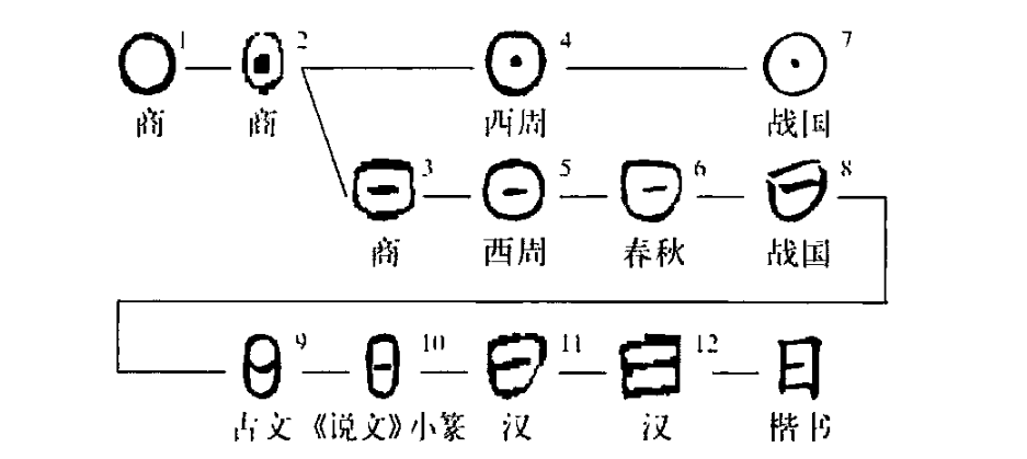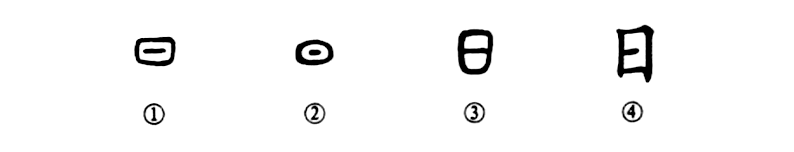 這就是“旭日東升”的“日”字。甲骨文①和金文②都像太陽的形狀。所以“日”是個象形字。③是小篆的形體,原來中間的一點則變成了一橫。楷書④是依小篆的形體寫為方形。