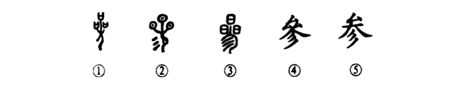 這是“人生不相見,動如參與商。”的“參”字,本為象形字。①是甲骨文的形體,下部為人形,人上有三顆星,表示參星高照。②是金文的形體。星的左下方有“彡”,表示星的光芒。朱芳圃說:“參象參宿三星在人頭上,光芒下射之形。”③為小篆的形體,與金文相似。④為楷書繁體字。⑤為簡化字。