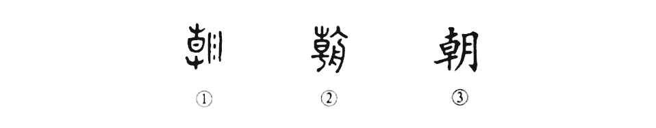 這是“朝辭白帝彩云間”的“朝”字。在金文①的左邊,上下部都是“屮(草)”,中間是個太陽,右邊是水,本義是太陽從地面(草地)上升起時,潮水上漲了。所以“朝”的本義是早晨,是個會意字。后來因為“朝”字右邊偽變成“月”,根本看不出水的樣子,所以在“朝”字的左邊又增加了三點水,寫作“潮”,自此以后“朝”字再不當“潮”字用了。小篆②的形體發生了偽變,其左邊的上部和中部還與金文類似,可是下部卻變得不像“草”的形狀了。右邊的“水”形卻錯變為上“人”下“舟”。③是楷書的形體,其左倒與金文有些類似,而右邊卻是從金文的“水”旁偽變為“月”旁,書寫方便多了。