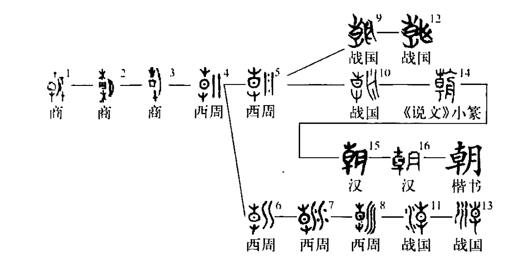 ”的訛變。但“舟”與“朝”聲古音接近,故可用為聲旁。“朝”字的本義是“早晨”。甲骨文:“癸丑卜,行貞:翌甲寅毓祖乙歲朝