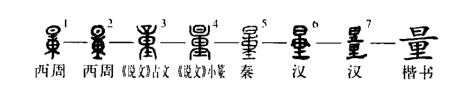 甲骨文構形有多種說法,何琳儀認為從“昜”從“東”,昜、東共享豎筆,“昜”是量的聲符。孫常敘認為不從“日”,所謂“日”形象囊袋的袋口,象張囊橐之口以量物之形,按此說與字形不合,“東”已象袋子上下兩端皆有束縛,故不能再象袋口。郭沫若認為此字是“亮”的古文,象太陽從東方升起,大放光明,按此說雖可從聲音方面說明“亮”與“量”的關系,但除音理之外,與“量”字的用義難以連系。甲骨文又有從“田”和從“束”之形,或不從“日”而從“子”形,所謂“子”形疑為筆畫增繁所致。