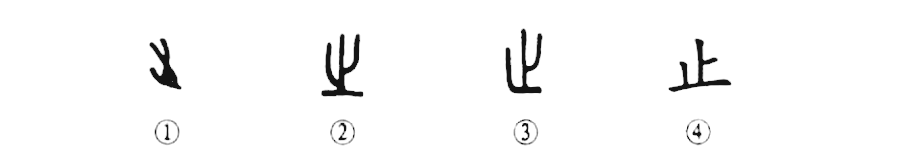 這個“止”字是個象形字。甲骨文①多像一只腳啊!腳趾朝左,腳后跟朝右。②是金文形體,③是小篆形體,這兩種形體非常類似。④是楷書的寫法,由小篆直接變來。