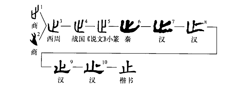 象形字。字本像人足之形,甲骨文中或寫實,或勾廓,字乃“趾”之初文。《林》2.9.7:“貞:疾止?”問足是否生病。《儀禮·士昏禮》:“御衽于奧,媵衽良席在東,皆有枕,北止。”鄭玄注:“止,足也。” “北止”義即趾向北,首向陽也。《合集》30810:“止我巳(祀)”,有學者認為“止”作停止講。“止”的本義是足,引申指腳趾。足在人體的最下面,又引申指地基,字后作“阯(址)”。通過腳可以去任何地方,故引申為至、臨義,由至、臨引申為停止、靜止義,進一步引申為停留、逗留義。由停留引申為居住、處所義。由停止義引申為禁止、去除義。由本義亦可引申指人的舉止、容止。“止”或與“之”通假。(陳英杰)