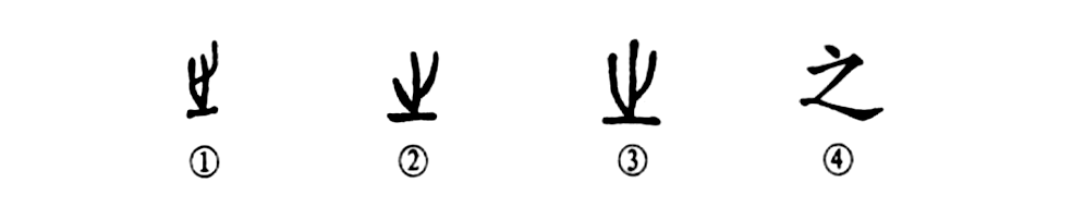這是個“之”字。甲骨文①的下部一條橫線表示這個地方,上部是一只腳趾朝上的腳,表示“從這里出發”的意思。所以“之”字的本義是“往”的意思。②是金文的形體。③是小篆的形體,大致都與甲骨文的形體相似。④是楷書的形體,它是由小篆蛻變而來的。