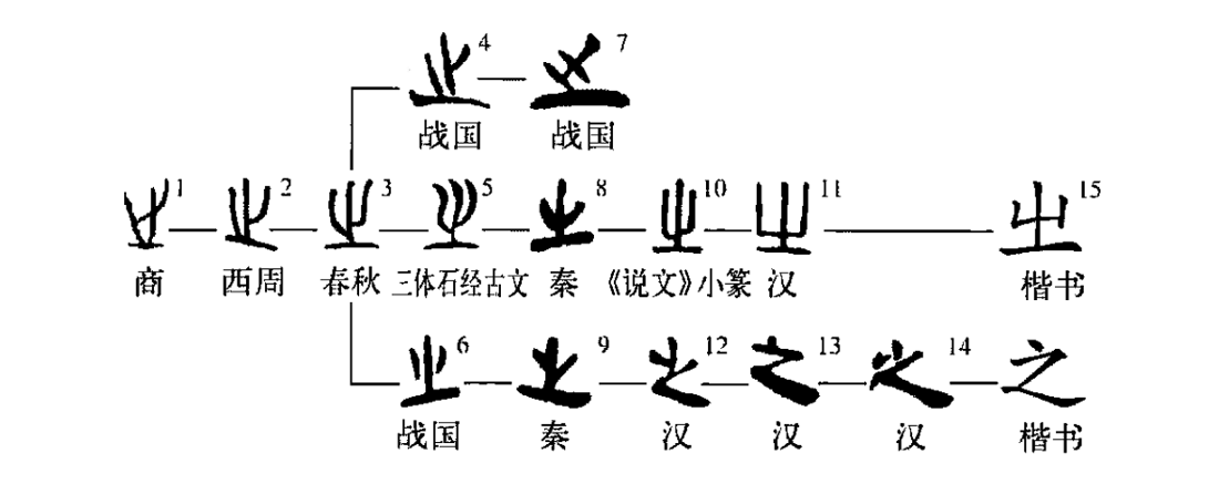 1-5《漢語字形表》233頁。6《郭店》96頁。7《包山》91頁。8、11-14《篆隸表》401頁。9《睡甲》91頁。10《說文》127頁。15《玉篇•之部》。