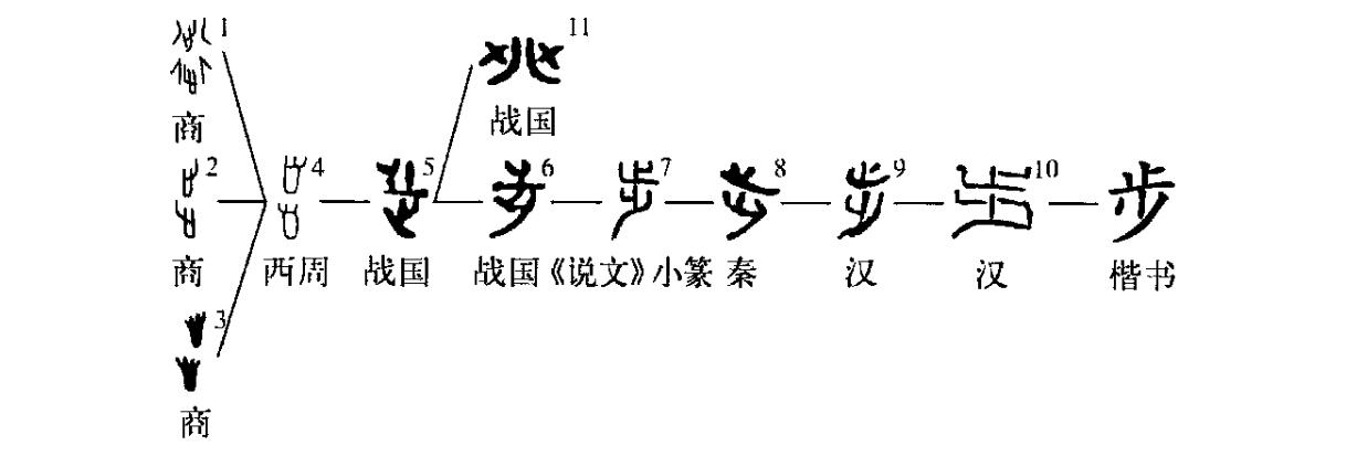 皆足之象形,左右異向者,一像左足,一像右足,“步”字像左右二足前后相承之形。甲骨文或從“行”旁,示在道路上行走之義。其本義就是行走。《乙》4693:“丙午卜,殼貞:翌丁未王步?”《書·武成》:“王朝步自周。”孔傳:“步,行也。”均用本義。引申出徐行、追隨義。古時一舉足叫跬(半步),兩足各跨一次叫步。由此引申為步伐、步驟義,亦引申用為長度單位。中山王兆域圖:“從內(nèi)宮至中宮卅六步。”今指行走時兩腳之間的距離。《說文·足部》有“踄”,訓(xùn)“蹈也”,蹈、行同義,“踄”與“步”當(dāng)為一字,“步”為象形字,“踄”疊加義旁“足”字。《中山王兆域圖》“步”字兩止左右并列,形意略有訛變。(陳英杰)