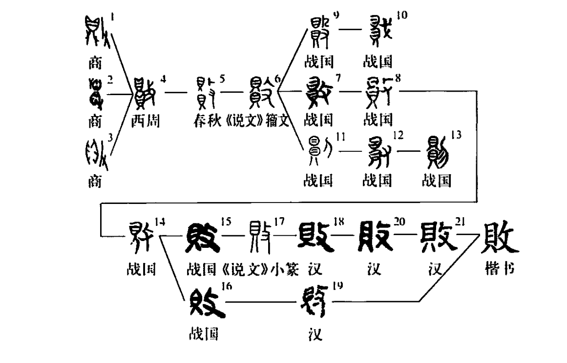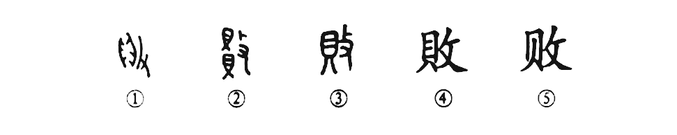 會意兼形聲字。從攴、貝(貝亦聲)。表意偏旁攴為手持器械以擊狀,貝為古代貨幣貝殼之象,二者結合會毀壞意。敗與貝聲韻并同。商代甲骨文已出現,構意微別。或從攴從鼎[鼎后訛作貝,參“貞(貞)”字條],或從手持貝與從手持貝相撞,或從攴貝,三者構意有別,然皆得會毀壞意。從西周到春秋(包括《說文》籀文)統一作從攴擊上下兩貝。至戰國則異形突出,攴旁或作殳、戈、刀、又,然此更替皆無妨于表意;至于作