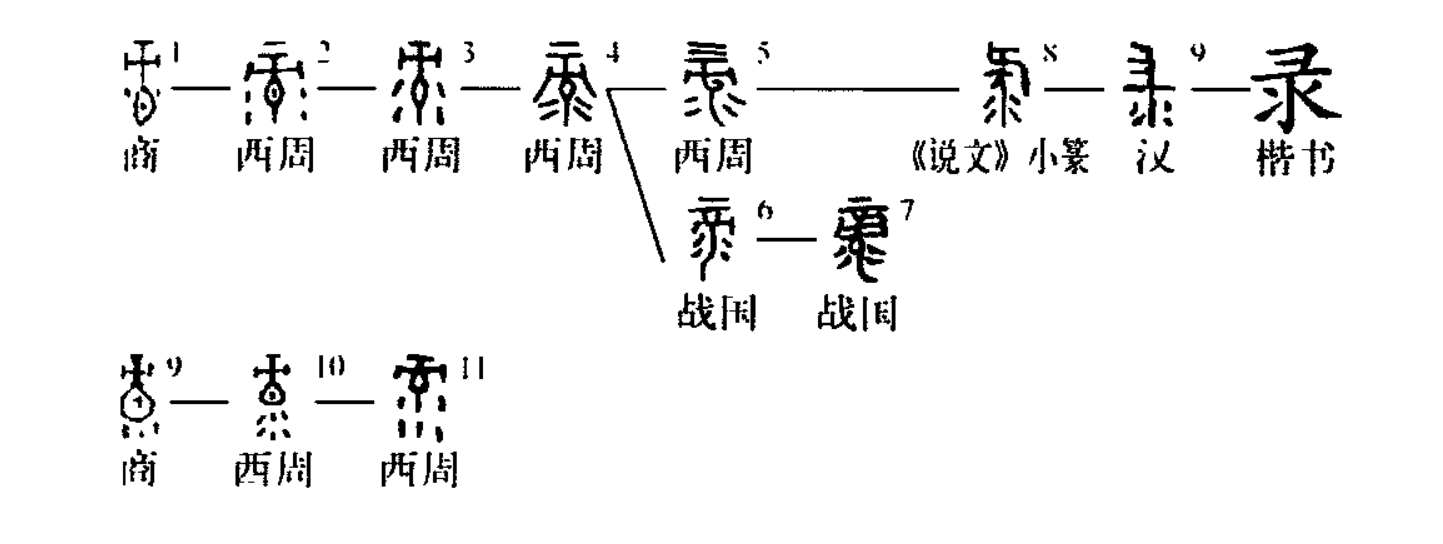 ”,象形意味稍有減弱?!墩f文》小篆即從此字形演變而來。對于“錄”的造字本義,《說文》:“錄,刻木錄錄也。象形。”未免解說有誤。甲骨文假借為“山麓”之“麓”:“辛酉,王田于雞錄。”(《合集》37848)金文通用為“福祿”之“祿”。