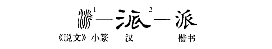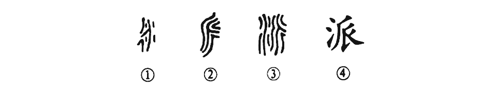 “茫茫九派流中國,沉沉一線穿南北。”這個“派”字本為象形字。①是甲骨文。左邊為“彳”,是支流的通道;右邊為河的干流,干流分出一條支流進入通道;周圍的四點表水形。②是金文的形體,中間的“人”字形像河流的主干分出一條支流。③是小篆的形體,左邊又增加“水”旁。④為楷書的寫法。