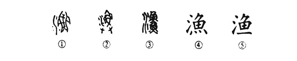 “月落烏啼霜滿天,江楓漁火對愁眠。”這個“漁”字是會意兼形聲的字。說它是會意:左“水”右“魚”,是在水中捕魚之義。說它是形聲,左形(水)右聲(魚),是個形聲字。甲骨文①的右邊是“魚”,左邊是“水”。金文②的形體繁雜多了,不過會意的意味更濃,上部的左邊是“水”,上部的右邊是“魚”,下部是兩只大手,這就表明在水中“撈魚摸蝦”就叫“漁”。小篆③卻變得沒有多少意思了,因?yàn)榘呀鹞闹械碾p手換成一條魚,反而造成了書寫上的不便。④是楷書形體,比小篆少了一條魚,很有必要。⑤是簡化字。