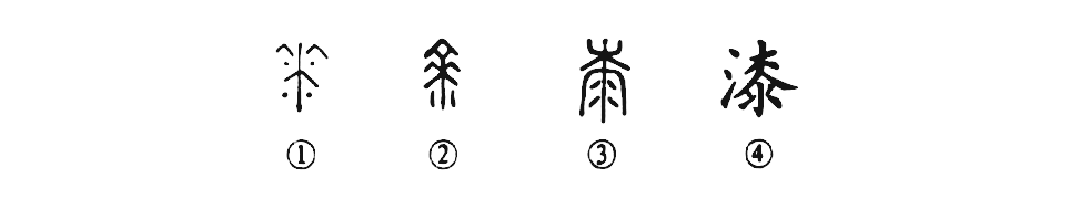 這是“如膠似漆”的“漆”字,本為象形字。①是金文的形體,像一棵漆樹的形狀,其中的四個點表示有漆滴下。②是古陶文的形體,與金文相類似。③是小篆的形體。④為楷書的寫法,左邊又增加了“水”,表示“漆”為液體。這就成為“從水桼聲”的形聲字了。