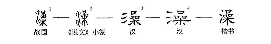 《說文》:“澡,灑手也。從水喿聲。”許慎說的“澡”字本義是正確的,但從甲骨文的形體看則為會意字,小篆變成了形聲字。