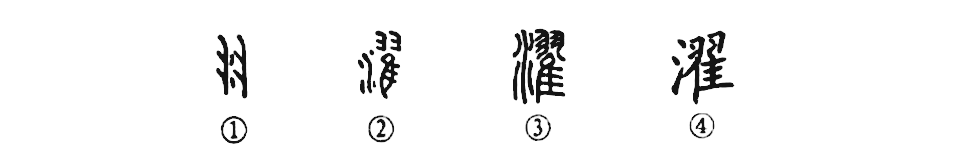 “何時此巖下,來作濯纓翁。”這個“濯”字讀作zhuó,本為會意字。①是甲骨文的形體,其左右兩側是兩把笤帚之形,中間是“水”,表示洗涮、洗滌。②是金文的形體,變為“從水翟聲”的形聲字了。③是小篆的形體,與金文極為相似。④為楷書的寫法。