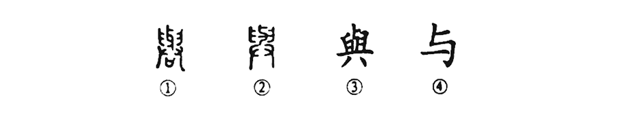 “與為千金之裘,而與狐謀其皮。”這個“與”字本是會意兼形聲的字。①是金文。四角是四只手,中間是個“與”字,表音,下面的“口”,表示一個器物。其大意是一雙手交一件器物給另一雙手。②是小篆的形體,其下部省略了“口”。③是楷書的形體,直接由小篆演變而來。④是簡化字,只保留了楷書中的讀音部分,書寫時省事多了。