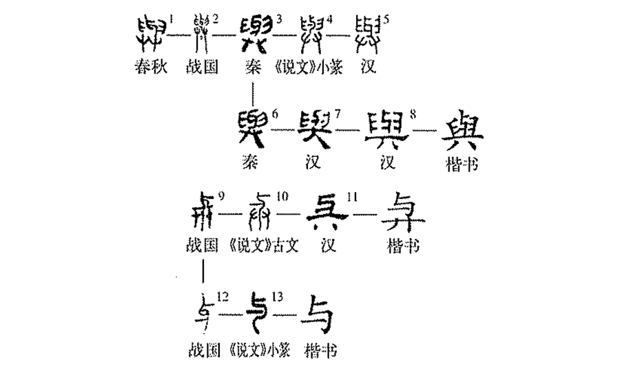 《說文》:“與,黨與也。”所謂“黨與”就是同盟者的意思。許慎的看法不妥。因“黨與”并非“與”字的本義。從金文的形體分析看,其本義是“給予”、“授予”義,讀作yǔ,如《史記•項羽本紀(jì)》:“與斗卮(zhī)酒。”就是給(他)一大杯酒的意思。從“給予”可以引申為“結(jié)交”,如“相與為鄰”。由此又引申為“參加”,讀作yù,如“與聞其事”、“與會者十余人”。至于《禮記•禮運》中“選賢與能”里的“與(與)”字,可不能解釋為“給予”、“結(jié)交”、“參加”,而是“舉”字的假借字。這句話的原意是:選拔賢才,舉薦能人。