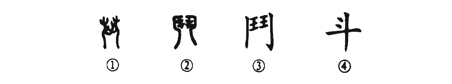 ?這是“斗爭”的“斗”字。甲骨文①是面對(duì)面的兩個(gè)武士,頭戴武士帽,伸著手互相搏斗。②是小篆的形體,變得不像人形了。③是楷書的寫法。④是簡化字。
